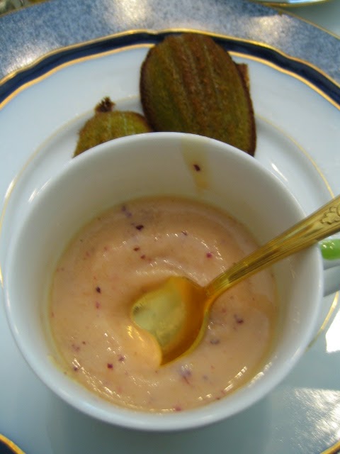 salière, j’apporte donc une coupelle. Nous passons maintenant à table, le potage est de courgettes, petits pois (jusqu'ici très banal), ce qui l'est moins les légumes sont cuits dans de l'eau de riz et agrémentés de feuilles de menthe coupées très fines. Il fait l'unanimité, tout le monde s'est resservi, même si en principe, cela ne se fait pas. Cela m'arrangeait, au moins ils ne repartiront pas affamés si la suite n'est pas à la hauteur...